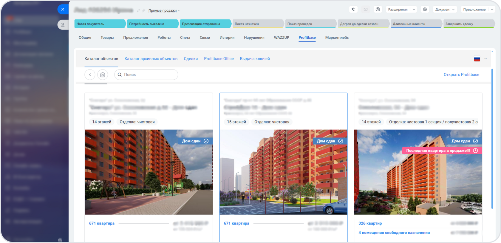 За счёт интеграции с Profitbase менеджер видит всю актуальную информацию по объектам и лидам в одном окне. Прямо во время разговора с клиентом он может подобрать объект с помощью фильтров, добавить выбранный лот в сделку, сформировать онлайн-презентацию и отправить её клиенту.