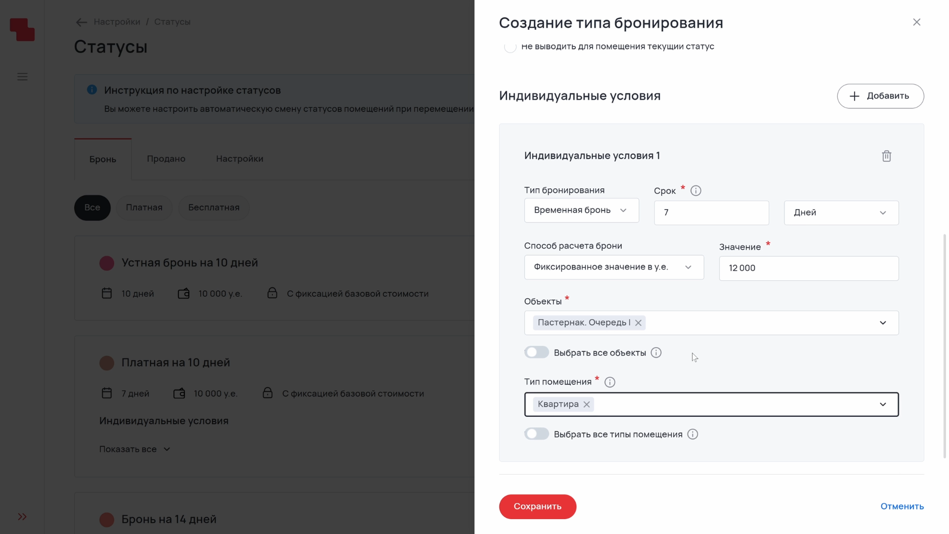 Теперь Онлайн-бронирование от Profitbase стало гибким инструментом управления спросом. Вы можете задавать разные условия для разных ЖК и типов помещений. Например, для ликвидных квартир установить более высокую стоимость брони, а для менее востребованных — смягчить условия. Это позволяет точечно регулировать динамику продаж.