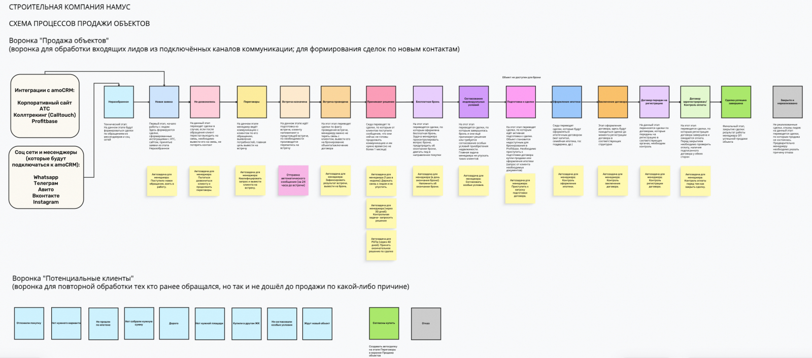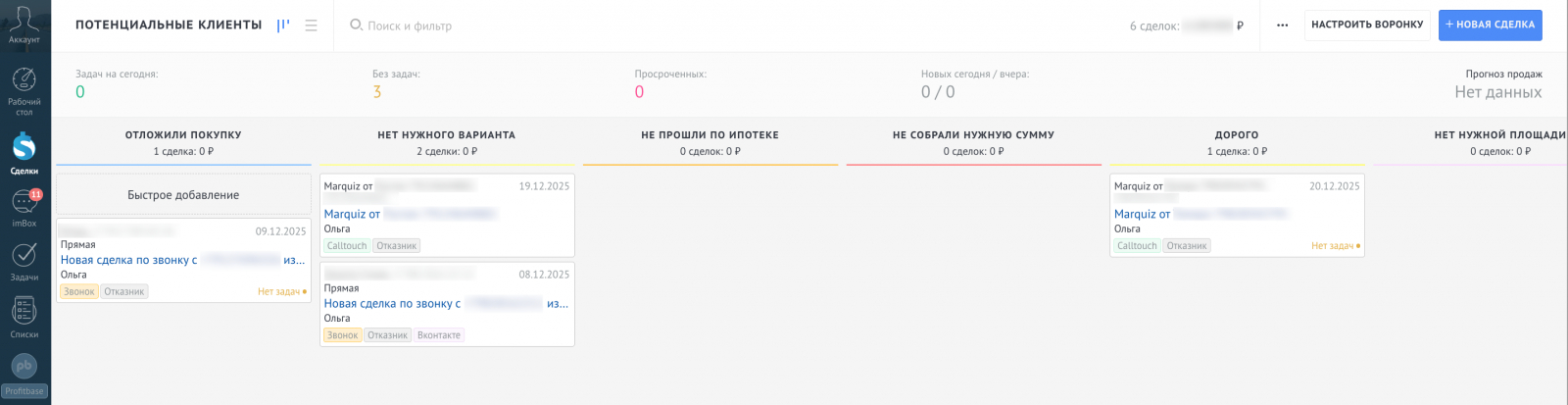 Отдельно выделили воронку для работы с отложенным спросом. В неё попадали клиенты, которые не принимали решение о покупке сразу и планировали вернуться к выбору после старта новых очередей или при накоплении первоначального взноса. Для таких сделок важно было сохранить контекст общения, зафиксировать интерес клиента и задать дальнейшие шаги работы.