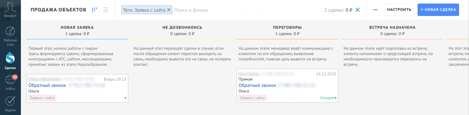 Для продаж настроили две воронки с разной логикой работы. Основная воронка использовалась для активных сделок — от первого контакта до выбора лота, бронирования и подготовки сделки. Этапы воронки отражали фактический ход продажи и фиксировали ключевые действия менеджера.
