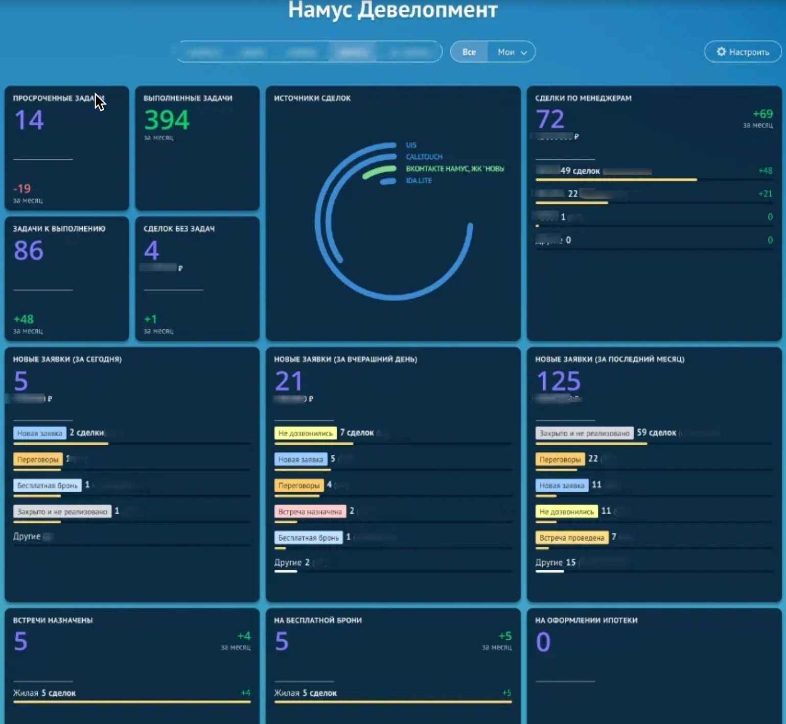 Для руководства настроили дашборды для текущего контроля. В них отображались загрузка менеджеров, статусы сделок и этапы, на которых они находятся. Отдельно были видны точки задержек — ситуации, где сделки требуют управленческого внимания.